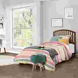 The Daniva with an ideal for farmhouse and coastal decor. This headboard features an understated design with a classic Walnut wood finish. A gently arched top rail and vertical slats make this wooden twin-size headboard an excellent option for any bedroom. Includes headboard and bed frame. Box spring and mattress not included. Customer assembly is required.