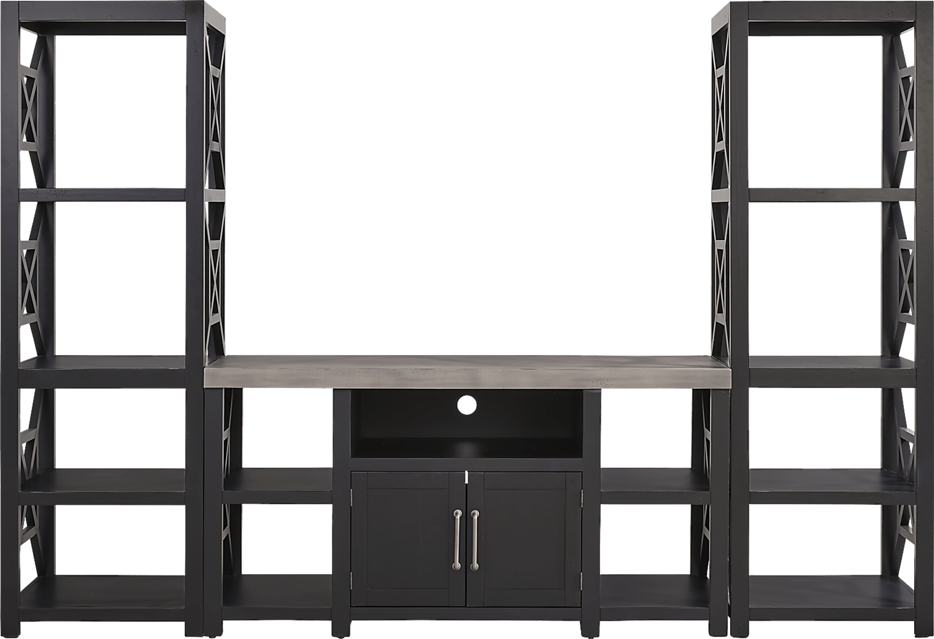 This 3-piece entertainment center is designed for maximum utility, featuring a total of 12 shelves. This includes an open shelving system ideal for displaying décor and books, as well as discreet cabinet doors for "hidden" storage of gaming consoles, media players, and other entertainment essentials. The flat-panel doors provide a sleek, transitional look while keeping cables and clutter out of sight.