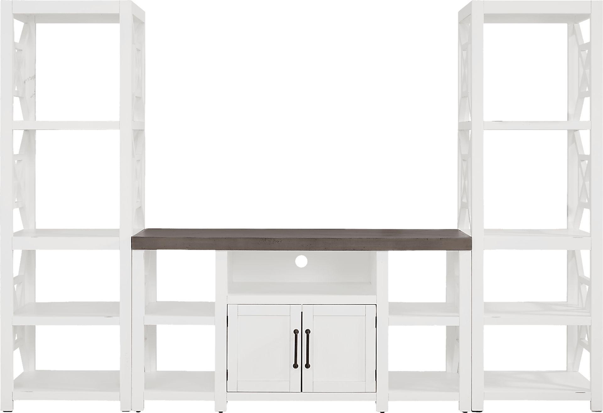 The central console of this unit measures 62 inches wide. As a general rule for both stability and aesthetics, your TV should be slightly narrower than the surface it sits on. This unit is ideal for most flat-screen televisions up to 65 inches. For those in open-concept living areas, the substantial 110-inch total width of the three-piece set creates a dedicated "entertainment zone," helping to anchor the room and define the space visually.