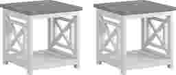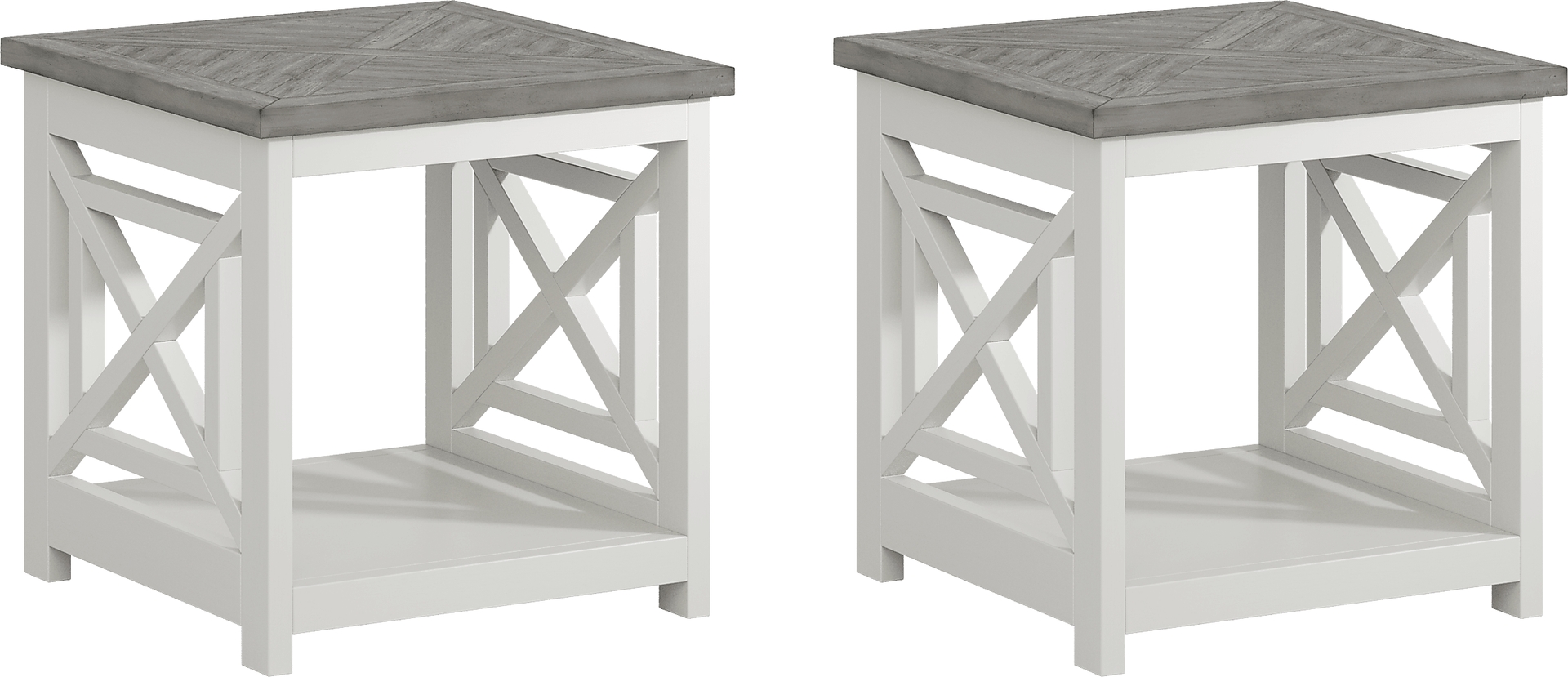 The Danusa end table set combines transitional styling with rustic elements for charming accents. Each table has a farmhouse-inspired look, crafted with a natural gray-finished top and a distressed white base. Along with two-tone color, it displays a decorative motif on each end above the lower shelf.