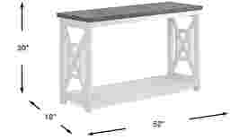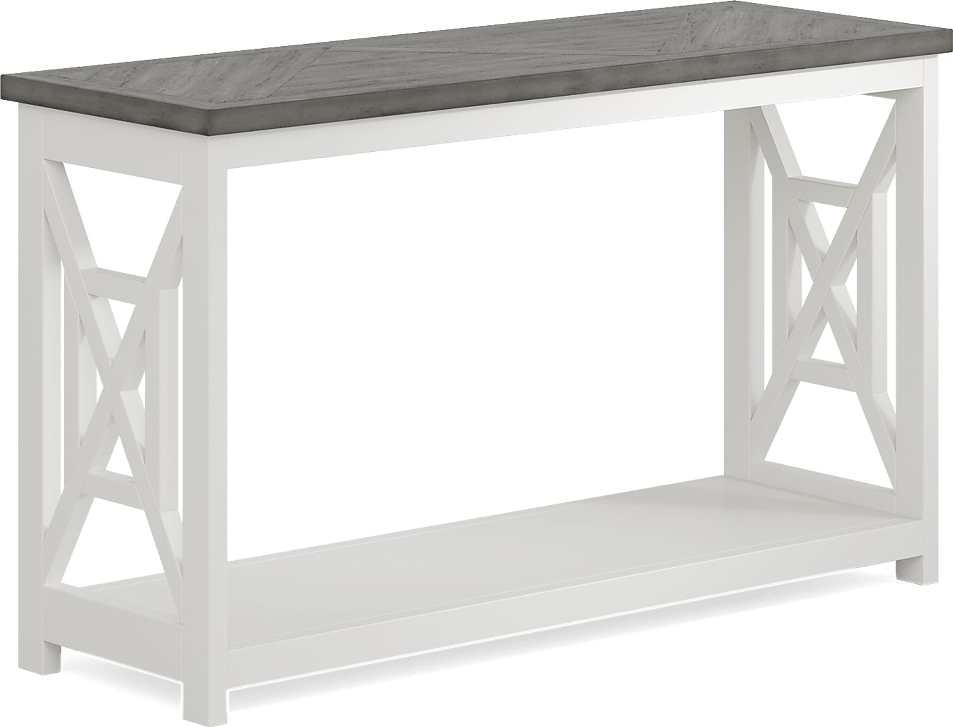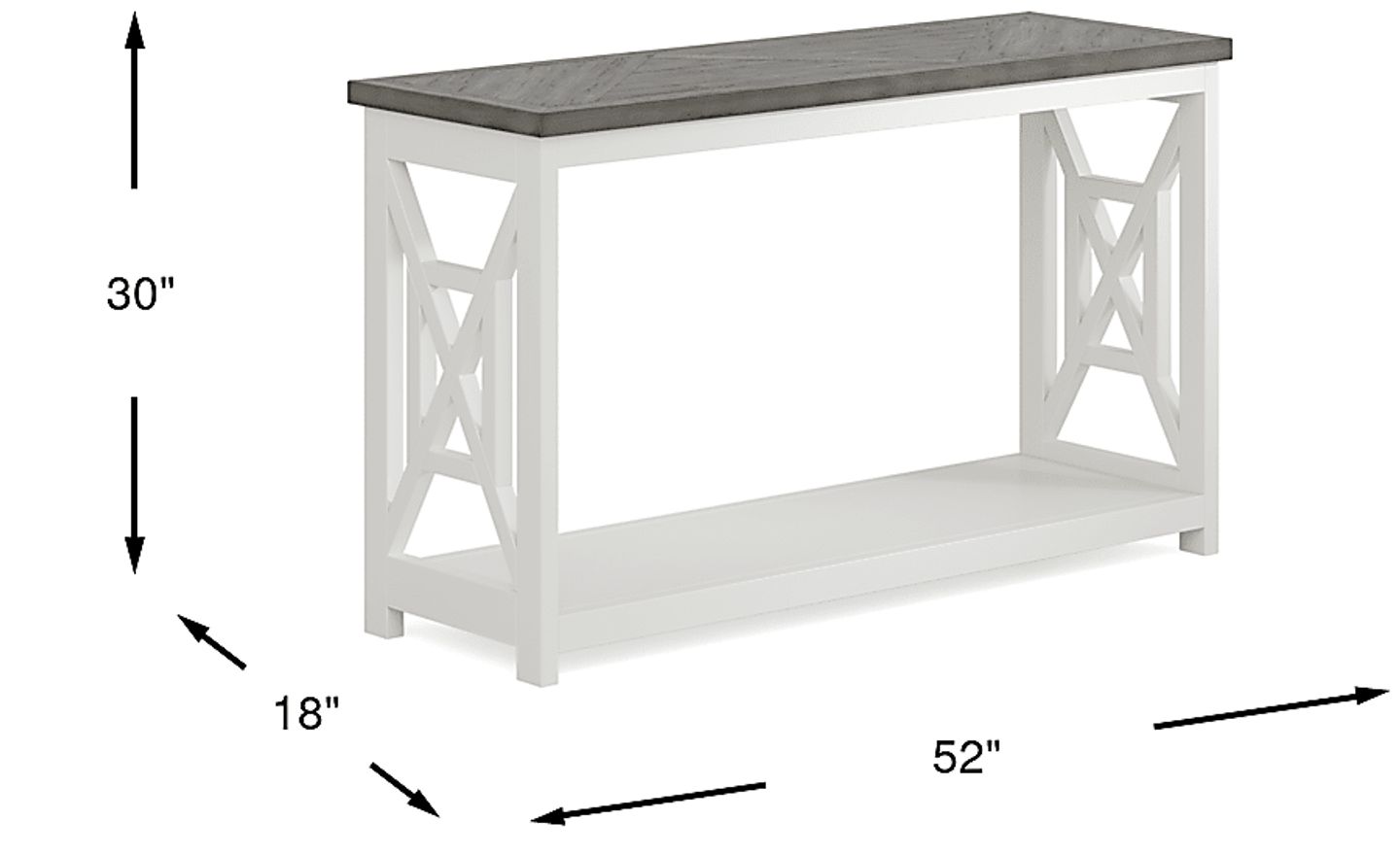 Harboring an austere appeal, the Danusa sofa table brings charm and style to your gathering area. This farmhouse-inspired table is crafted of pine with a natural gray-finished top and a distressed white base. Along with two-tone color, it displays a decorative motif on each end above the lower shelf.