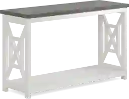 Harboring an austere appeal, the Danusa sofa table brings charm and style to your gathering area. This farmhouse-inspired table is crafted of pine with a natural gray-finished top and a distressed white base. Along with two-tone color, it displays a decorative motif on each end above the lower shelf.