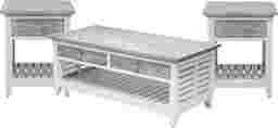 Add a touch of charm and sophistication to your room with the Daphne II table collection. Blending two tones, this three piece set features a gray finish that enhances the natural beauty of the veneers' wood grain. Storage abounds with drawers built into both the cocktail table and matching end tables. White shutter style frames add the perfect final contrast to each piece.