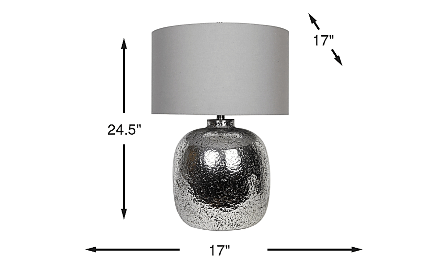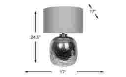 Adding a touch of glamour, the Dapple Court table lamp is sure to brighten up your space. Its shiny, glistening base is crafted of dark gray metal and glass with an authentic granular appearance. This lamp accommodates a maximum 150-watt standard bulb and includes a three-way switch.