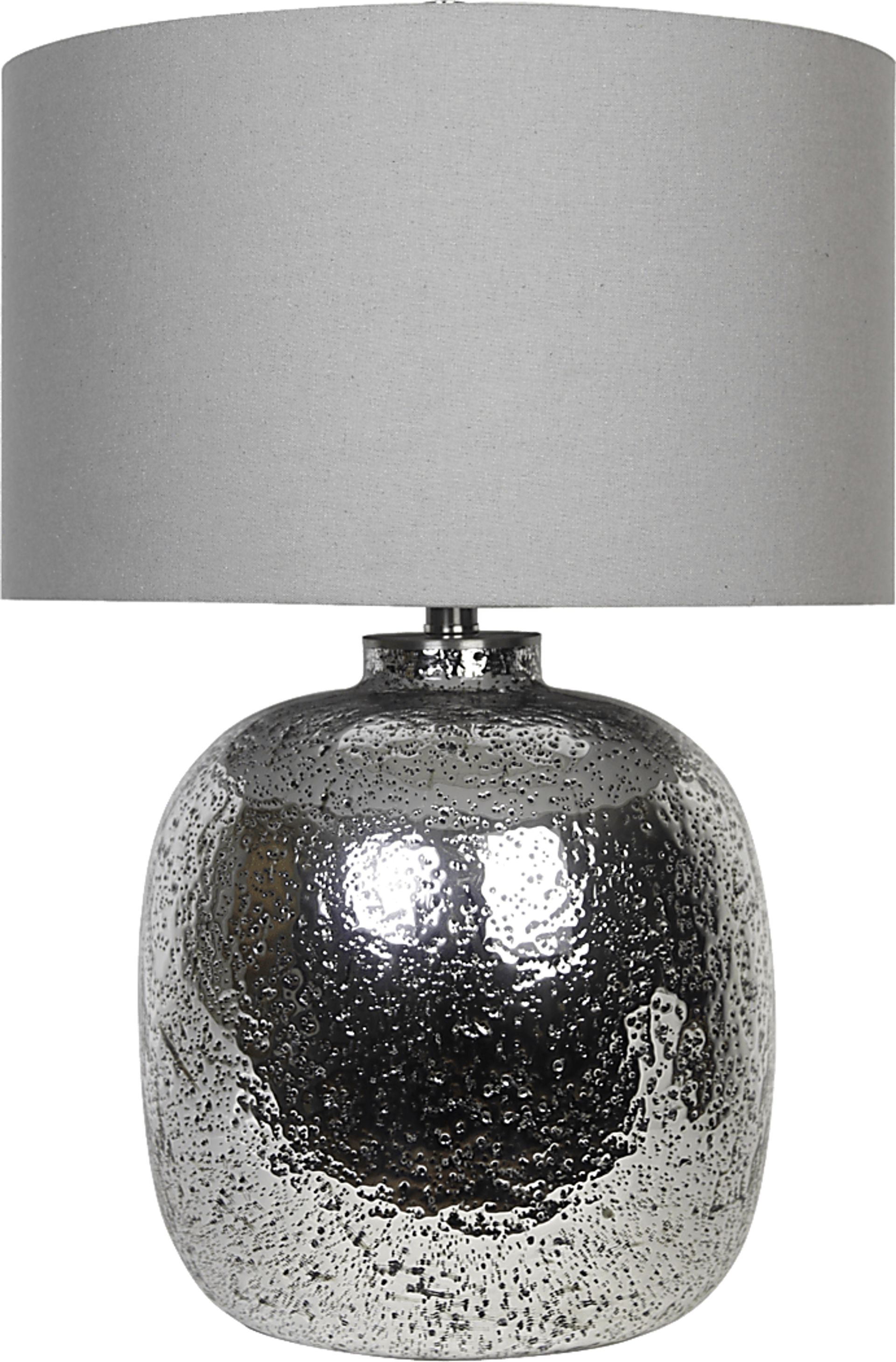 Based on our expertise with these materials, we recommend dusting the gray fabric drum shade with a soft brush attachment on a vacuum or a clean lint roller. For the glistening metal and glass base, use a dry, non-abrasive microfiber cloth to maintain the shiny finish and keep the granular texture free of dust. Avoid liquid cleaners that could seep into the textured design.