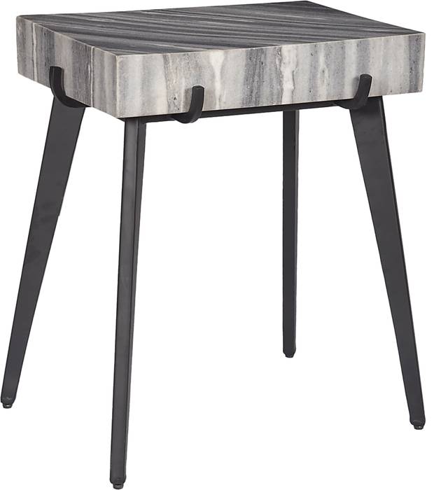 Four tapered metal legs in a black powder coated finish hold aloft a stunning rectangular polished marble top, thick and richly veined in shades of gray and white. It's naturally beautiful, and a natural choice for any decor.