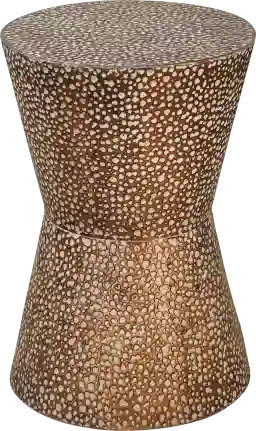 Featuring a hammered metal drum shape, the Daresa accent table is the perfect addition to any room. Finished in an antiqued copper bronze with a dusty stone glaze. Customer assembly is required.