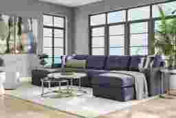 Discover the limitless possibilities of the Drew & Jonathan ModularOne, thoughtfully designed with comfort and flexibility in mind. This customizable seating solution features individual pieces that can be configured to any shape your room needs - the seating arrangement you want is always right at your fingertips. Each individual piece is upholstered on all sides in handsome dark blue textured fabric. The seating area has welted track arms, top-stitched seat cushions and button-tufted back cushions for an elegant silhouette. Seats with power reclining functionality allow for easy adjustment of the footrest, providing the ultimate in personalized comfort. Includes LAF chaise, 2 armless power recliners, and RAF chaise. Upholstery: 100% Polypropylene.