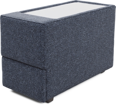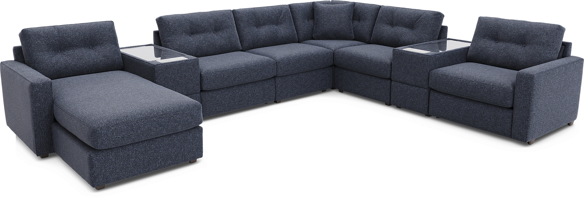 Discover the limitless possibilities of the Drew & Jonathan ModularOne, thoughtfully designed with comfort and flexibility in mind. This customizable seating solution features individual pieces that can be configured to any shape your room needs - the seating arrangement you want is always right at your fingertips. Each individual piece is upholstered on all sides in handsome dark blue textured fabric. The seating area has welted track arms, top-stitched seat cushions and button-tufted back cushions for an elegant silhouette. Two media consoles provide hidden storage, USB charging ports, wireless charging, bluetooth-enabled speakers, and double as side tables with sleek acrylic tops. Includes LAF chaise, 2 consoles, 3 armless chairs, wedge, and RAF chair. Upholstery: 100% Polypropylene.