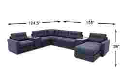 Discover the limitless possibilities of the Drew & Jonathan ModularOne, thoughtfully designed with comfort and flexibility in mind. This customizable seating solution features individual pieces that can be configured to any shape your room needs - the seating arrangement you want is always right at your fingertips. Each individual piece is upholstered on all sides in handsome dark blue textured fabric. The seating area has welted track arms, top-stitched seat cushions and button-tufted back cushions for an elegant silhouette. Two media consoles provide hidden storage, USB charging ports, wireless charging, bluetooth-enabled speakers, and double as side tables with sleek acrylic tops. Includes RAF chaise, 2 media consoles, 3 armless chairs, wedge, and LAF chair. Upholstery: 100% Polypropylene.
