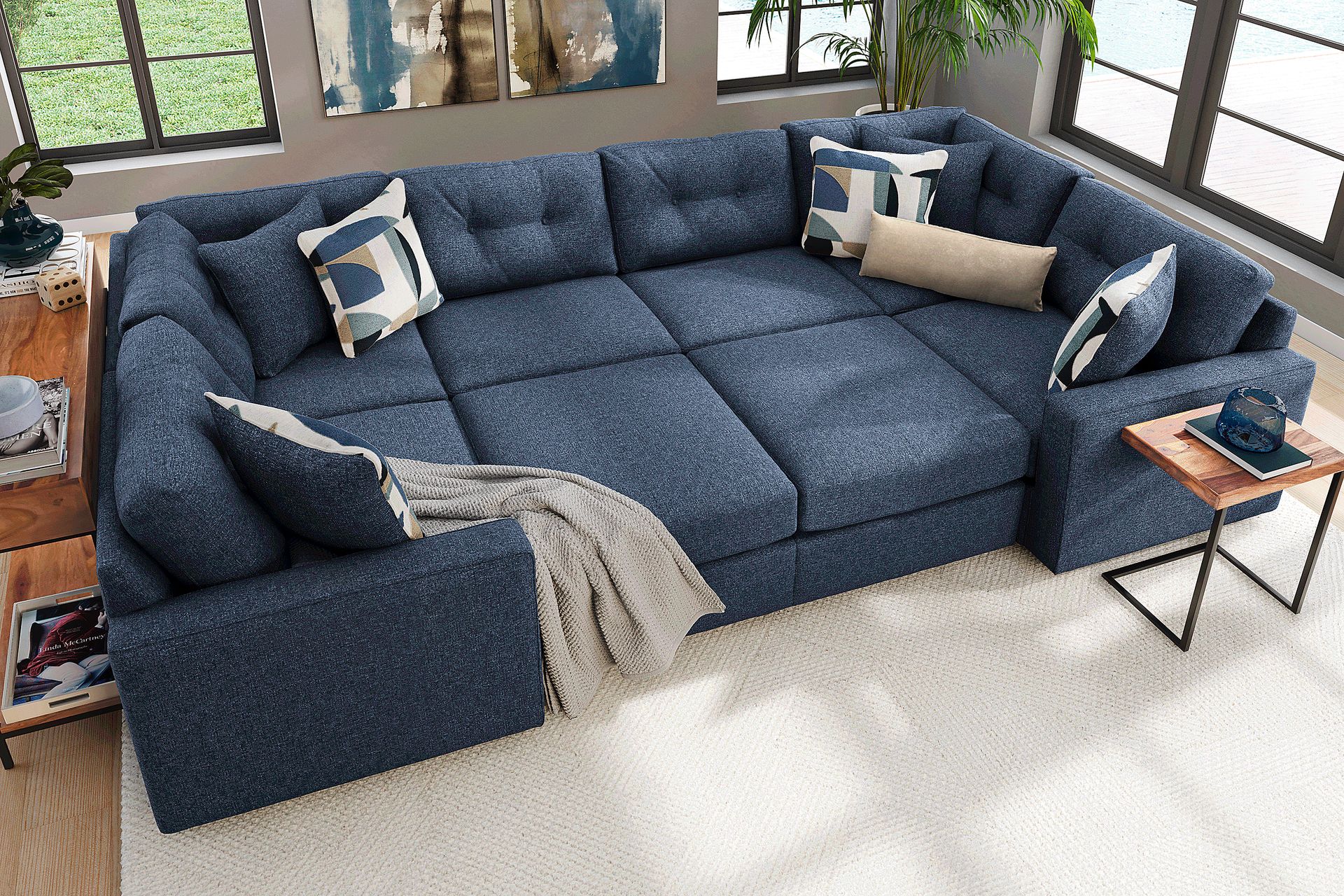 With total dimensions of 138"w x 75"d, this 8-piece sectional is ideally scaled to anchor large living rooms or open-concept floor plans. Because every piece is finished on all sides, the sectional looks beautiful from any angle, allowing you to place it in the center of a room rather than just against a wall, which is a common requirement in modern suburban homes and spacious urban lofts.