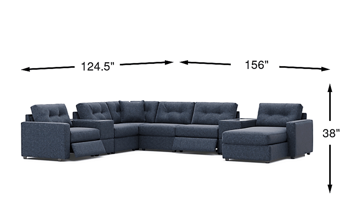 Discover the limitless possibilities of the Drew & Jonathan ModularOne, thoughtfully designed with comfort and flexibility in mind. This customizable seating solution features individual pieces that can be configured to any shape your room needs - the seating arrangement you want is always right at your fingertips. Each individual piece is upholstered on all sides in handsome dark blue textured fabric. The seating area has welted track arms, top-stitched seat cushions and button-tufted back cushions for an elegant silhouette. Includes RAF chaise, 2 consoles, armless power recliner, 2 armless chairs, wedge, and LAF power recliner. Upholstery: 100% Polypropylene.