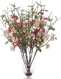 This arrangement is crafted with high-quality silk that mirrors the delicate texture and vibrant appearance of real spring blooms. The petite cherry blossoms feature nuanced ivory and blush tones, creating a lush, organic look. To further enhance the realism, the arrangement is set in a glass pedestal vase filled with "faux water"—a clear resin that provides the authentic look of a fresh-cut display without the maintenance or clouding associated with real water.