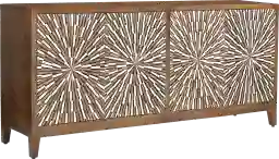 Elevate your space with this stunning four-door Darque credenza that boasts a unique and eye-catching design. The solid mango wood frame is finished with a deep, natural tone, accentuated by a striking white bone inlay design on each of the door fronts. The uninterrupted design is complemented with touch-latch hardware that allows for smooth opening and closing using upgraded European hinges. Not only is this piece aesthetically pleasing, but it also provides ample storage space within its shelved interior. The back features cord management access to easily connect your entertainment devices without seeing unsightly power cords. Customer assembly is required.