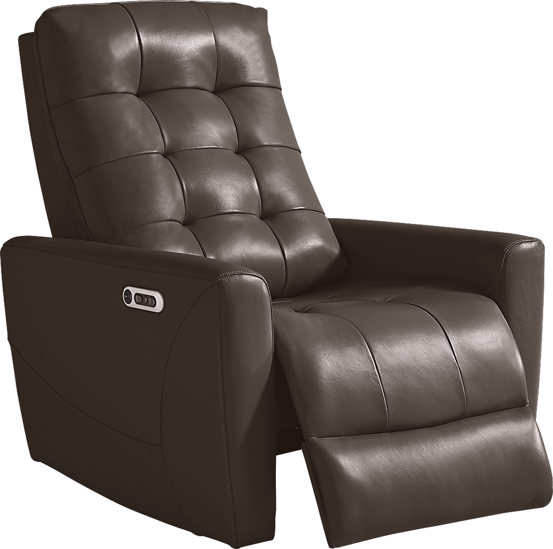 The sleek curvature and uptown sophistication of the Dashwood recliner delivers a tranquil, spa-style lounging experience. Modern in style and upholstered in a top grain leather where the body touches, this recliner features a luxurious button-tufted look, comfortable padded arms, a chaise pad footrest and single attached seat and back cushion for ultimate leisure and relaxation. Dual power reclining options allow for headrest and footrest adjustment while the slight curve in the back provides support in the lumbar area to give you a soothing seat to unwind in after a long day. Upholstery: Top grain leather where the body touches. Polyurethane sides and back.
