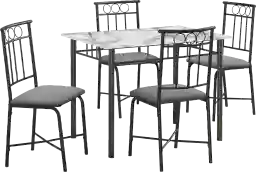 Welcome a casual family dining experience with this modern Daveitta 5 piece set dining table set It features a 40 rectangular dining table with a stunning white marble look laminate top and a sturdy black metal base for a chic contemporary style. Perfect for a small kitchen or dining area, this space saving set easily accommodates up to 4 people. The armless chairs are upholstered in a thick grey cotton and linen mix fabric with matching black metal accents to provide comfortable seating for any meal. Enjoy a fashionable, reliable, and easy to clean dining table set that will last through many dinner parties and family meals. Customer assembly is required.