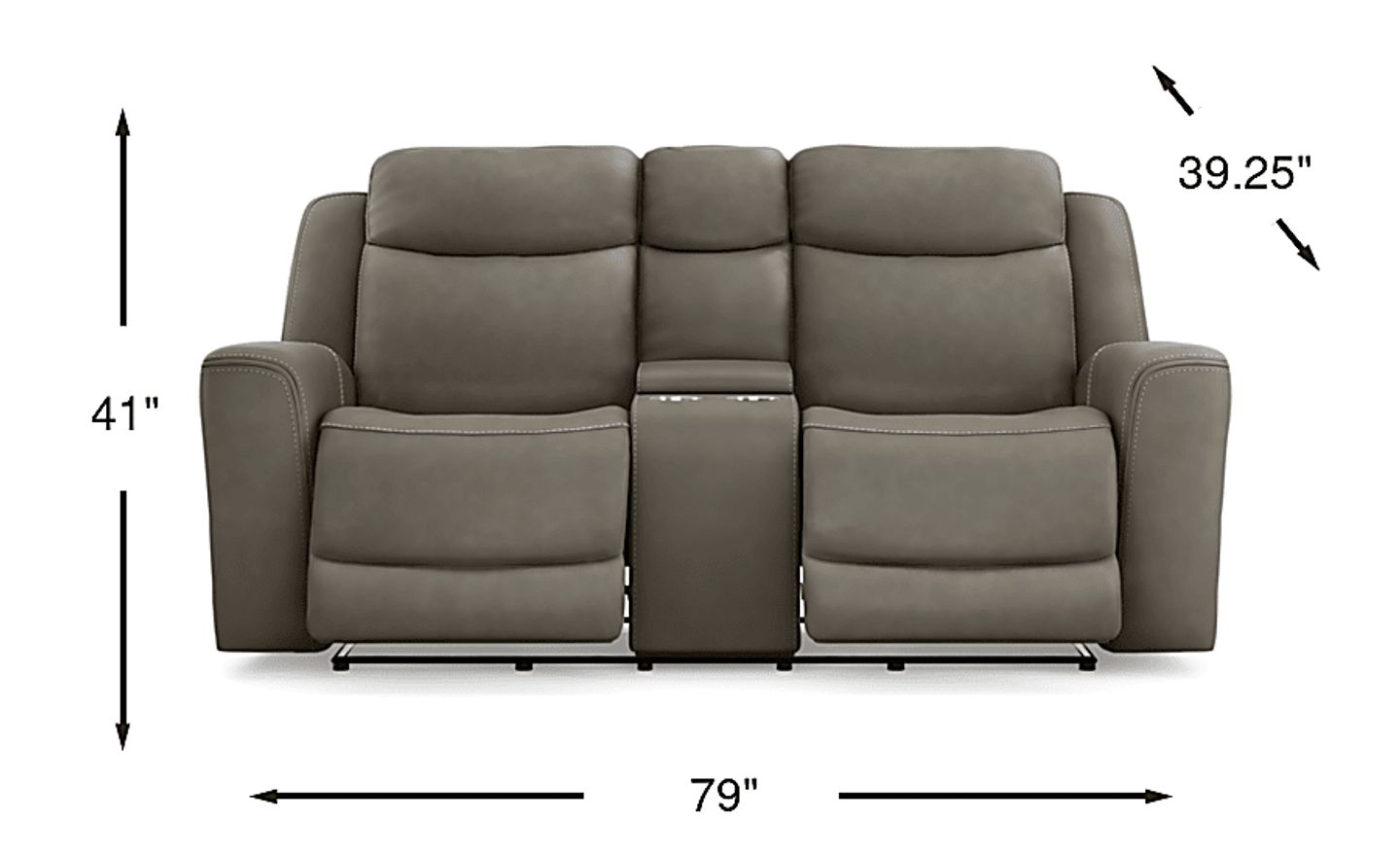 Sleek lines, luxurious comfort, and casual artistry meld into the space-defining appeal of the Drew & Jonathan Davidson loveseat. A transitional spin on a family favorite, this piece is upholstered in dark gray top grain leather where the body touches. Top-stitched seams stand out on every curve and exaggerated slope, while tight, angular structural details on the arms and back maintain a strong outline when viewed from anywhere in the room. The track arms roll inward to deep, curved seats that cradle guests in luxurious comfort. Dual power reclining takes relaxation to the next level and includes adjustable headrests and footrests, with USB power on the control panel for easy charging and custom comfort. This loveseat also features a convenient center console with cupholders and hidden storage. Upholstery: Top grain leather where the body touches and polyurethane fabric sides and backs.