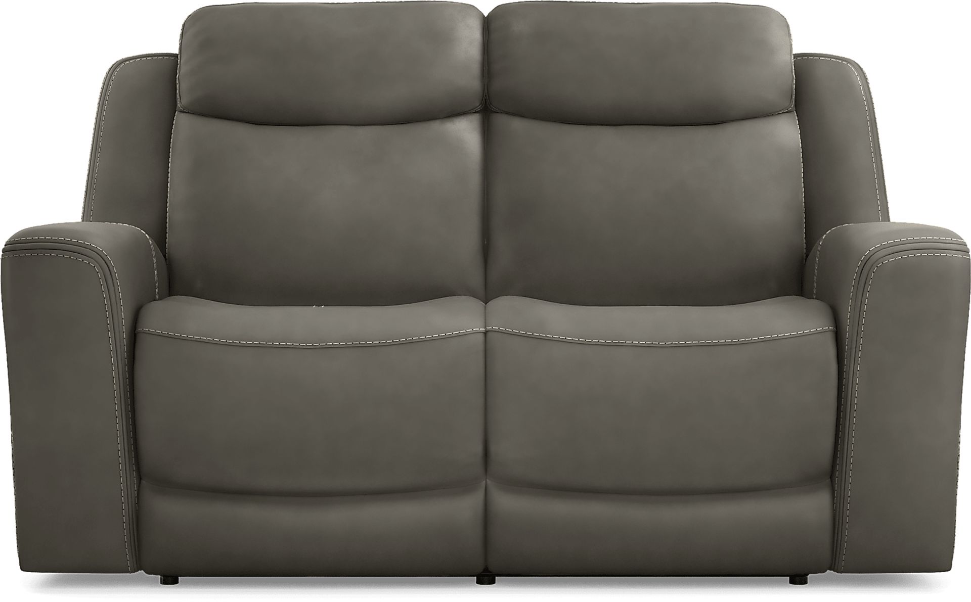 Sleek lines, luxurious comfort, and casual artistry meld into the space-defining appeal of the Drew & Jonathan Davidson loveseat. A transitional spin on a family favorite, this piece is upholstered in dark gray top grain leather where the body touches. Top-stitched seams stand out on every curve and exaggerated slope, while tight, angular structural details on the arms and back maintain a strong outline when viewed from anywhere in the room. The track arms roll inward to deep, curved seats that cradle guests in luxurious comfort. Upholstery: Top grain leather where the body touches and polyurethane fabric sides and backs.