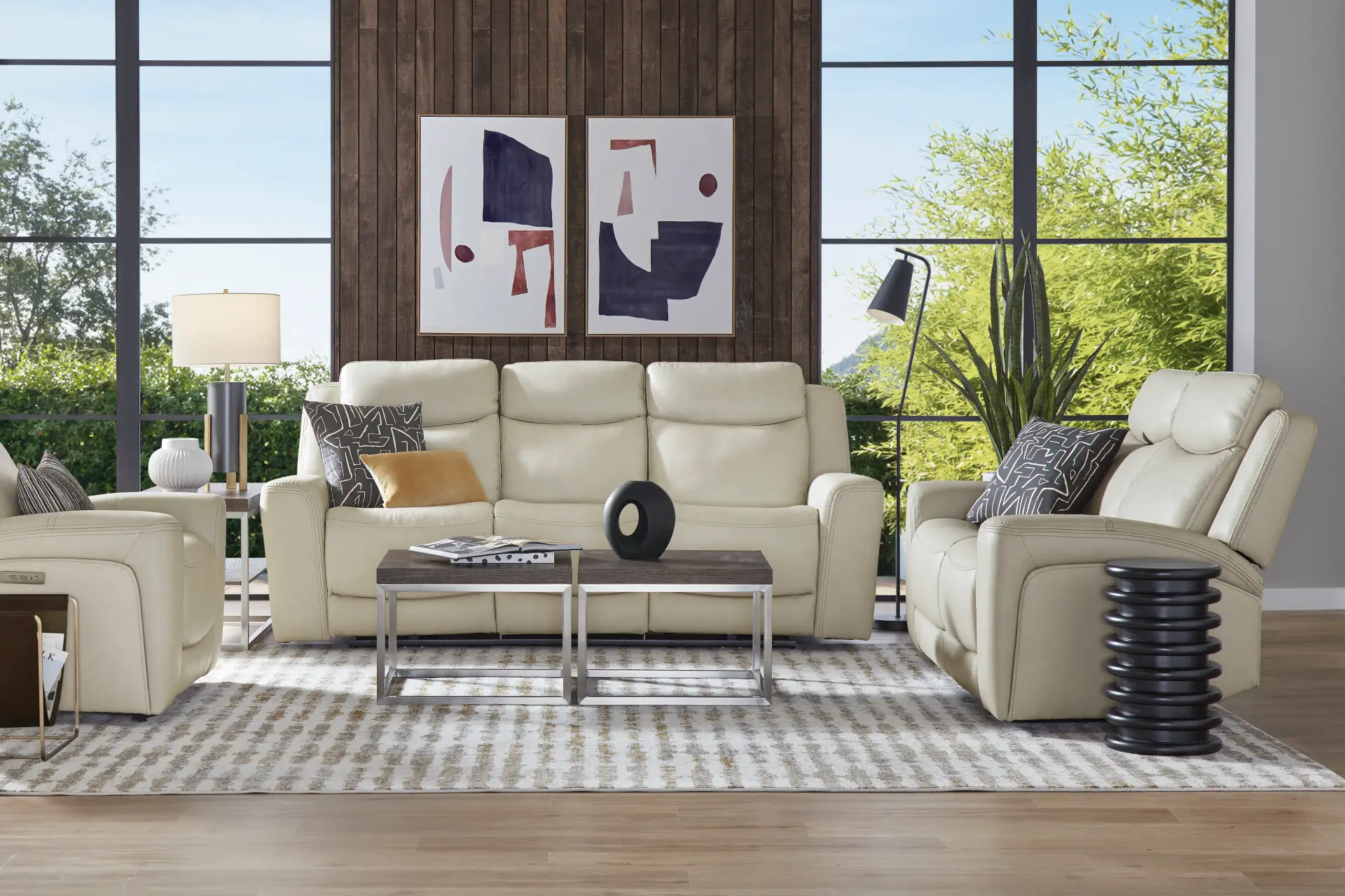 Sleek lines, luxurious comfort, and casual artistry meld into the space-defining appeal of the Drew & Jonathan Davidson living room. A transitional spin on a family favorite, this set is upholstered in platinum top grain leather where the body touches. Top-stitched seams stand out on every curve and exaggerated slope, while tight, angular structural details on the arms and backs maintain a strong outline when viewed from anywhere in the room. The track arms roll inward to deep, curved seats that cradle guests in luxurious comfort. Dual power reclining takes relaxation to the next level and includes adjustable headrests and footrests, with USB power on the control panel for easy charging and custom comfort. Upholstery: Top grain leather where the body touches and polyurethane sides and backs. Leather is a durable, low maintenance product; however, general regular maintenance is necessary. To keep your leather clean, vacuum it regularly, removing any dust, and clean it with water and a mild non-detergent soap. Tables not as shown in room image. Accent pillows not included.