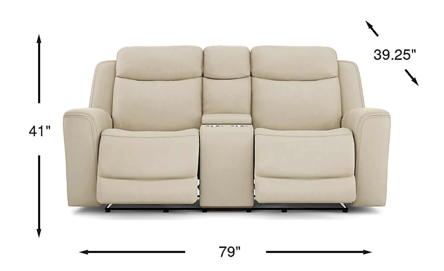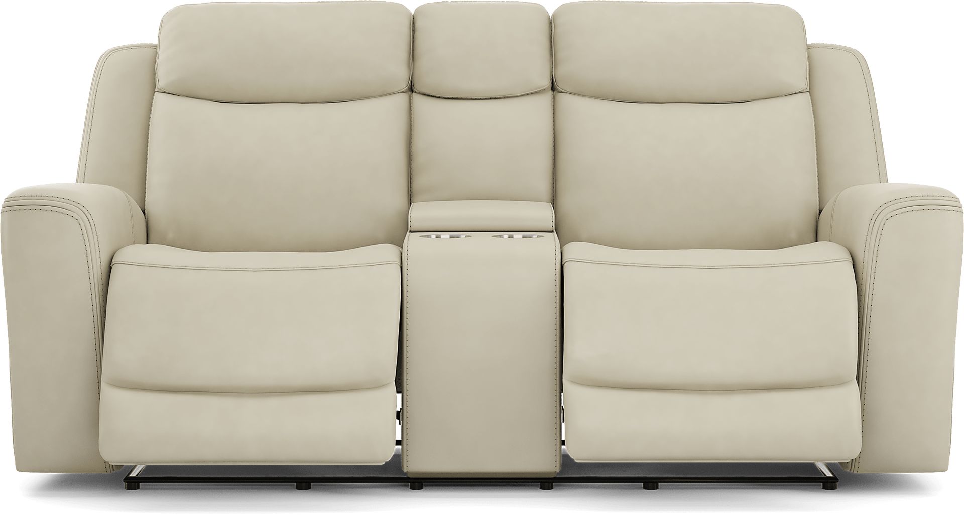 Sleek lines, luxurious comfort, and casual artistry meld into the space-defining appeal of the Drew & Jonathan Davidson loveseat. A transitional spin on a family favorite, this piece is upholstered in platinum top grain leather where the body touches. Top-stitched seams stand out on every curve and exaggerated slope, while tight, angular structural details on the arms and back maintain a strong outline when viewed from anywhere in the room. The track arms roll inward to deep, curved seats that cradle guests in luxurious comfort. Dual power reclining takes relaxation to the next level and includes adjustable headrests and footrests, with USB power on the control panel for easy charging and custom comfort. This loveseat also features a convenient center console with cupholders and hidden storage. Upholstery: Top grain leather where the body touches and polyurethane sides and backs.