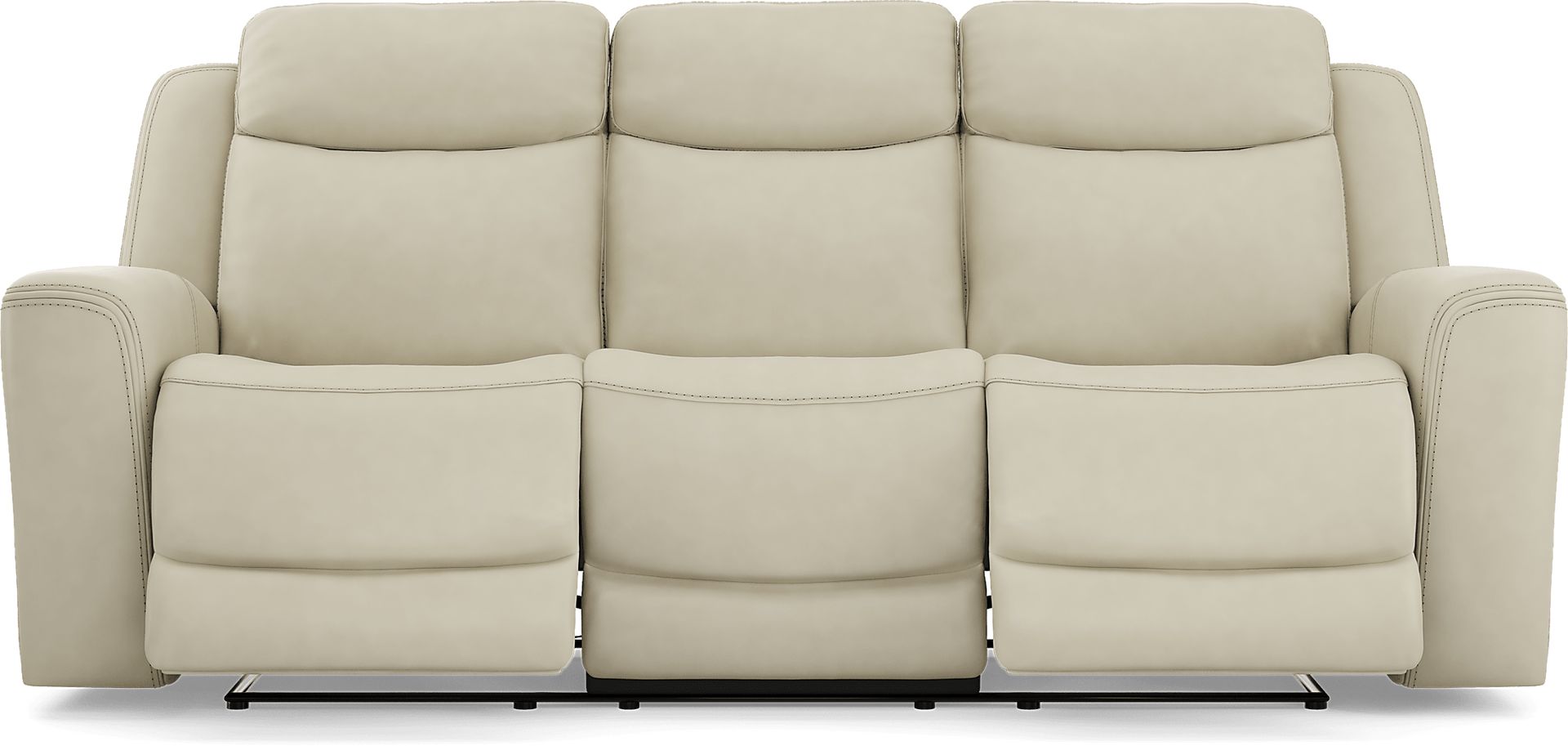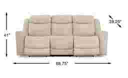 Sleek lines, luxurious comfort, and casual artistry meld into the space-defining appeal of the Drew & Jonathan Davidson sofa. A transitional spin on a family favorite, this piece is upholstered in platinum top grain leather where the body touches. Top-stitched seams stand out on every curve and exaggerated slope, while tight, angular structural details on the arms and back maintain a strong outline when viewed from anywhere in the room. The track arms roll inward to deep, curved seats that cradle guests in luxurious comfort. Dual power reclining takes relaxation to the next level and includes adjustable headrests and footrests, with USB power on the control panel for easy charging and custom comfort. Upholstery: Top grain leather where the body touches and polyurethane sides and backs.