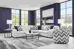 Add clean and contemporary style to your home with the Davilla sectional living room. Upholstered in soft chenille fabric, the sectional features a blue hue that fits many color schemes. Sleek, rounded track arms and large seats make this collection a stylish and spacious choice. To help your sectional last longer, the seat and back cushions are conveniently reversible. Complementing navy blue and chevron print accent pillows add visual interest. Upholstery: 90% Polyester, 10% Acrylic. Cleaning Instructions: Use water based cleaning agents or foam. Lamp not as shown in room image.