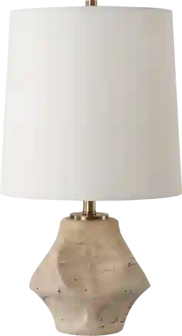 The Dawes Reef Beige Lamp features a scooped-out travertine base paired with plated antique brass accents. The slightly tapered round hardback shade is covered in white linen fabric. Partial assembly may be required.