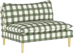 Designed around a simple L-shaped frame, the Deep Forest settee makes its statement in sage buffalo square cotton upholstery on sleek tapered natural wood legs. It is comfortably designed with plush cushioning seat of 47"W x 22"D. The settee is handcrafted in Illinois, USA. Customer assembly is required. This piece is made to order and may take up to 6 weeks to deliver.