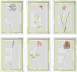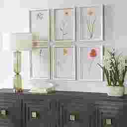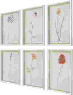Deffi framed prints are a stunning set of six floral watercolors, each delicately rendered against a natural linen background, offering an elegant and timeless addition to any space. Each work of art is surrounded by a beautiful white wood grain veneer frame with gold inner liner.