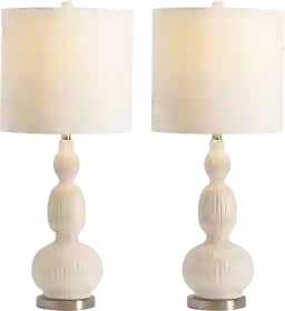 The Dehon Creek lamp set of two combines transitional and coastal styles to give you a versatile piece that will work with any decor. A round crystal base supports a body featuring three levels of textured ceramic. A white glaze on the body complements the tall white drum shade sitting atop the piece. Partial assembly may be required.