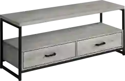 Double up on storage with this Deike TV stand that offers 2 tiers and 2 drawers to neatly organize your electronics and other items. The spacious top shelf with thick-panel construction accommodates most TVs when centered. Below, the open-concept shelf provides ample room for audio-visual components and easy cable management, while the 2 drawers can store remotes, game controllers, or entertainment center accessories. The shelves and drawers in a grey wood-look finish are supported by a sleek black metal frame that gives a modern look. With its space-saving design, this media console is a great choice for a living room or bedroom in an apartment, condo, or small home. Customer assembly is required.