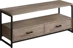 Double up on storage with this Deike TV stand that offers 2 tiers and 2 drawers to neatly organize your electronics and other items. The spacious top shelf with thick-panel construction accommodates most TVs when centered. Below, the open-concept shelf provides ample room for audio-visual components and easy cable management, while the 2 drawers can store remotes, game controllers, or entertainment center accessories. The shelves and drawers in a dark taupe wood-look finish are supported by a sleek black metal frame that gives a modern look. With its space-saving design, this media console is a great choice for a living room or bedroom in an apartment, condo, or small home. Customer assembly is required.