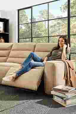An easy seaside calm settles in like an evening stroll along the serene pacific coastline as the Del Mar collection from Drew & Jonathan brings sophisticated comfort to the center of everyday relaxation. Upholstered with soft woven microfiber in a sandy brown hue, this modern sectional features sleek track arms, wide seats and channeled backs that add tailored texture and support. Dual power reclining lets you adjust both headrest and footrest with effortless ease, while USB-A and USB-C charging ports on the control panels keep devices close and ready. Upholstery: 100% polyester.