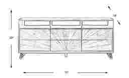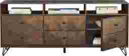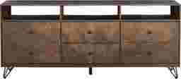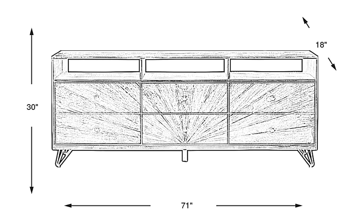 Simple, sophisticated and altogether practical, the Del Sol console adds warmth and charm to any surroundings. From the open segmented shelving to the six drawers, the console delivers an abundance of storage space. Constructed of pine wood solids and pine veneers in an elegant sunburst pattern, this mid-modern urban beauty's gorgeous look is completed with black metal hairpin legs.