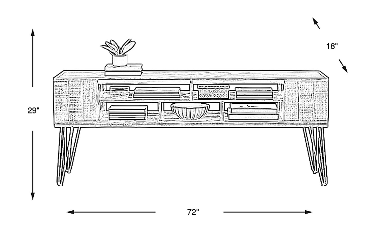 Simple, sophisticated and altogether practical, the Del Sol sofa console adds warmth and charm to any surroundings. Constructed of pine wood solids and pine veneers in an elegant sunburst pattern, the console delivers ample additional storage space. From its open side cubby to its long, segmented shelving across the piece's length, this mid-modern urban beauty's gorgeous look is completed with black metal hairpin legs.