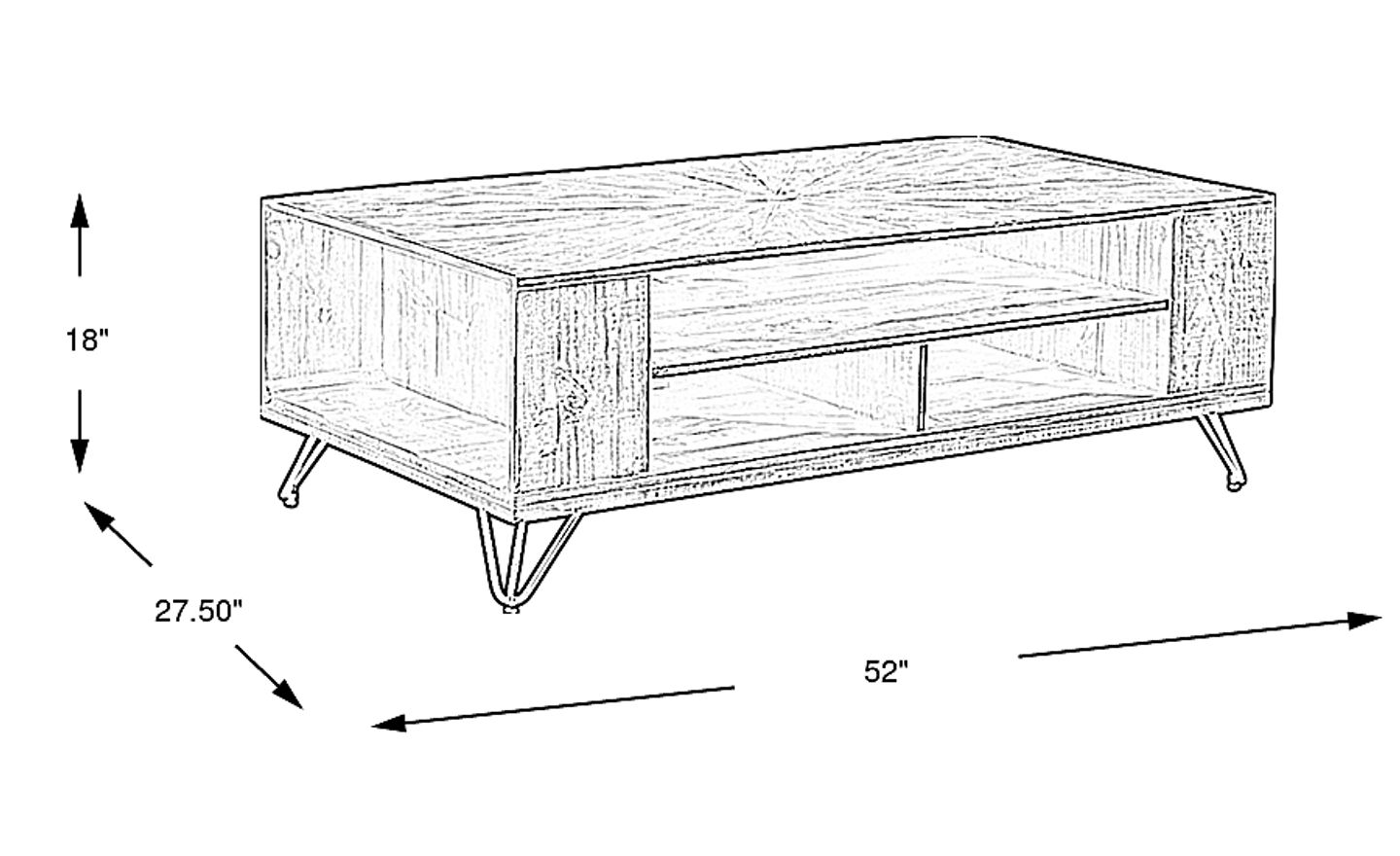 Simple, sophisticated and altogether practical, the Del Sol rectangular cocktail table adds warmth and charm to any surroundings. Constructed of pine wood solids and pine veneers in an elegant sunburst pattern, this table delivers ample additional storage space. From its open side cubby to its easy access shelves, this mid-modern urban beauty's gorgeous look is completed with black metal hairpin legs.