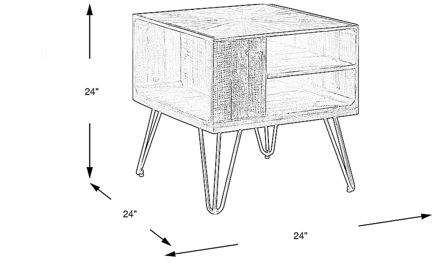Simple, sophisticated and altogether practical, the Del Sol square end table adds warmth and charm to any surroundings. Constructed of pine wood solids and pine veneers in an elegant sunburst pattern, this table delivers ample additional storage space. From its open side cubby to its easy access shelves, this mid-modern urban beauty's gorgeous look is completed with black metal hairpin legs.