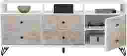 This console is an excellent solution for urban living or smaller spaces where maximizing floor area is essential. The 30-inch height and black metal hairpin legs provide an elevated, "leggy" profile that creates visual lightness by allowing the floor to be visible beneath the unit. This design trick makes a room feel more open rather than boxed in. Additionally, the combination of six drawers for hidden storage and open shelving for media components helps reduce clutter in compact environments.