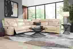 With charismatic charm and an inner glow through each enticing curve and corner, the Delaney Point sectional's refined elegance feels as easy as a Sunday afternoon and as finely appointed as an Italian suit. Beige top grain leather where the body touches is accented with evocative top-stitched seams throughout. Luscious pillow arms complement the wide seats, inviting long sessions of luxurious relaxation. With the pull of a small handle the footrest extends in a classic reclining motion. LAF recliner, armless chair, corner wedge, armless recliner, RAF recliner. Upholstery: top grain leather where the body touches and vinyl sides and backs.