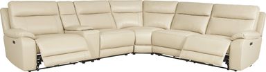 With charismatic charm and an inner glow through each enticing curve and corner, the Delaney Point sectional's refined elegance feels as easy as a Sunday afternoon and as finely appointed as an Italian suit. Beige top grain leather where the body touches is accented with evocative top-stitched seams throughout. Luscious pillow arms complement the wide seats, inviting long sessions of luxurious relaxation. Power reclining includes adjustable footrests, with USB-A and USB-C charging ports on control panels mounted to the armrests. A storage console completes the look with a pair of cupholders for total convenience. LAF power recliner, console, armless chair, corner wedge, armless recliner, RAF power recliner. Upholstery: top grain leather where the body touches and vinyl sides and backs.