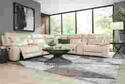 With charismatic charm and an inner glow through each enticing curve and corner, the Delaney Point sectional's refined elegance feels as easy as a Sunday afternoon and as finely appointed as an Italian suit. Beige top grain leather where the body touches is accented with evocative top-stitched seams throughout. Luscious pillow arms complement the wide seats, inviting long sessions of luxurious relaxation. Power reclining includes adjustable footrests, with USB-A and USB-C charging ports on control panels mounted to the armrests. Two storage consoles complete the look with a pair of cupholders each for total convenience. Upholstery: Top grain leather where the body touches and polyurethane fabric sides and backs. Leather is a durable, low maintenance product, however, general regular maintenance is necessary. To keep your leather clean, vacuum it regularly, removing any dust, and clean it with water and a mild non-detergent soap.