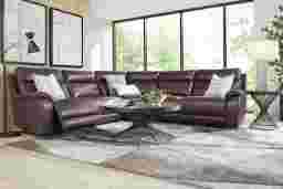 With charismatic charm and an inner glow through each enticing curve and corner, the Delaney Point sectional's refined elegance feels as easy as a Sunday afternoon and as finely appointed as an Italian suit. Brown top grain leather where the body touches is accented with evocative top-stitched seams throughout. Luscious pillow arms complement the wide seats, inviting long sessions of luxurious relaxation. Power reclining includes adjustable footrests, with USB-A and USB-C charging ports on control panels mounted to the armrests. LAF power recliner, armless chair, corner wedge, armless recliner, RAF power recliner. Upholstery: top grain leather where the body touches and vinyl sides and backs.