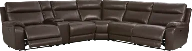 With charismatic charm and an inner glow through each enticing curve and corner, the Delaney Point sectional's refined elegance feels as easy as a Sunday afternoon and as finely appointed as an Italian suit. Brown top grain leather where the body touches is accented with evocative top-stitched seams throughout. Luscious pillow arms complement the wide seats, inviting long sessions of luxurious relaxation. Power reclining includes adjustable footrests, with USB-A and USB-C charging ports on control panels mounted to the armrests. A storage console completes the look with a pair of cupholders for total convenience. LAF power recliner, console, armless chair, corner wedge, armless recliner, RAF power recliner. Upholstery: top grain leather where the body touches and vinyl sides and backs.