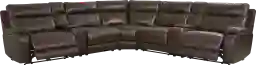 With charismatic charm and an inner glow through each enticing curve and corner, the Delaney Point sectional's refined elegance feels as easy as a Sunday afternoon and as finely appointed as an Italian suit. Brown top grain leather where the body touches is accented with evocative top-stitched seams throughout. Luscious pillow arms complement the wide seats, inviting long sessions of luxurious relaxation. Power reclining includes adjustable footrests, with USB-A and USB-C charging ports on control panels mounted to the armrests. Two storage consoles complete the look with a pair of cupholders each for total convenience. Upholstery: Top grain leather where the body touches and polyurethane fabric sides and backs. Leather is a durable, low maintenance product, however, general regular maintenance is necessary. To keep your leather clean, vacuum it regularly, removing any dust, and clean it with water and a mild non-detergent soap.