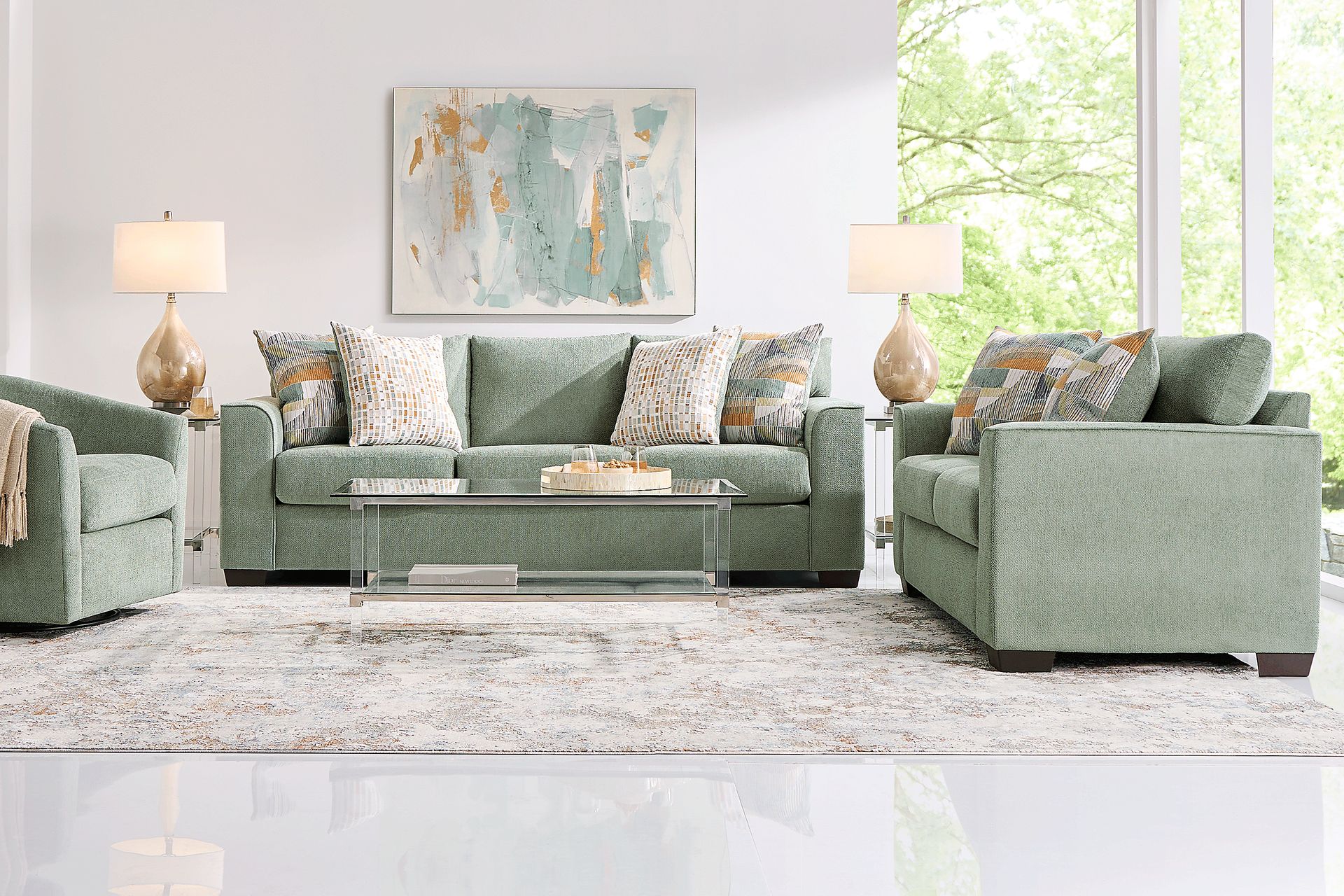 Like a gentle breeze on a warm day, the Delcrest collection is a breath of fresh air with its calming hues and soothing ambiance. This contemporary living room is upholstered in a plush misty green colored chenille, and its graceful silhouette is enhanced by rounded wedge arms and tapered square legs in a warm brown finish. Woven accent pillows fully set the scene with their complimentary mosaic pattern. Upholstery: 100% Polyester. Cleaning Instructions: Use water based cleaning agents or foam.