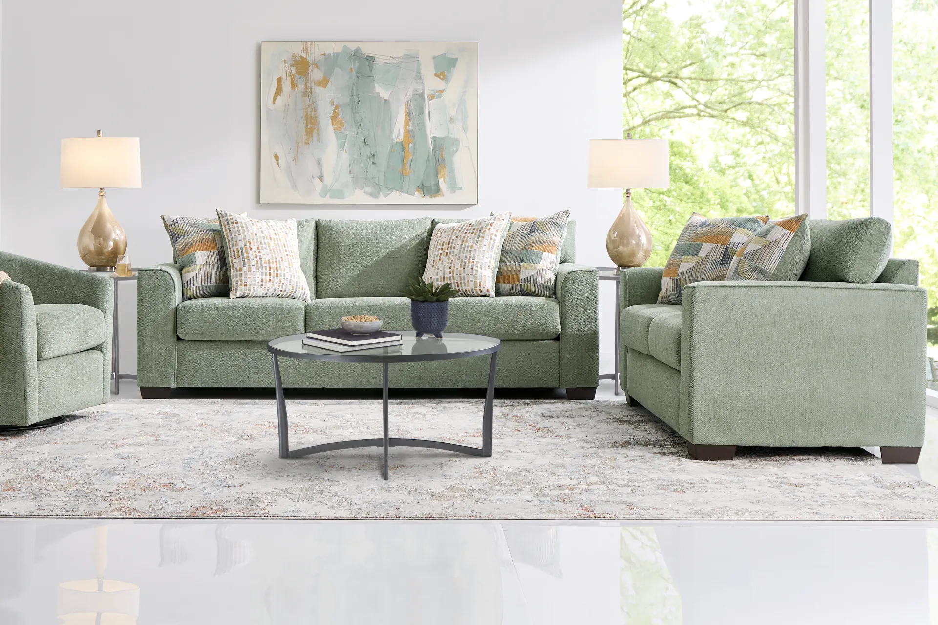 Like a gentle breeze on a warm day, the Delcrest collection is a breath of fresh air with its calming hues and soothing ambiance. This contemporary living room is upholstered in a plush misty green colored chenille, and its graceful silhouette is enhanced by rounded wedge arms and tapered square legs in a warm brown finish. Woven accent pillows fully set the scene with their complimentary mosaic pattern. Upholstery: 100% Polyester. Cleaning Instructions: Use water based cleaning agents or foam.