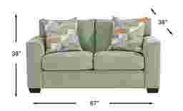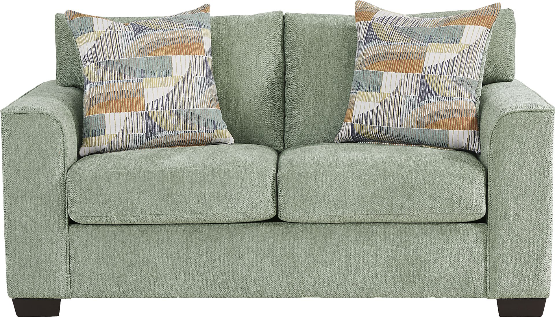 Like a gentle breeze on a warm day, the Delcrest collection is a breath of fresh air with its calming hues and soothing ambiance. This contemporary loveseat is upholstered in a plush misty green colored chenille, and its graceful silhouette is enhanced by rounded wedge arms and tapered square legs in a warm brown finish. Woven accent pillows fully set the scene with their complimentary mosaic pattern. Upholstery: 100% Polyester.