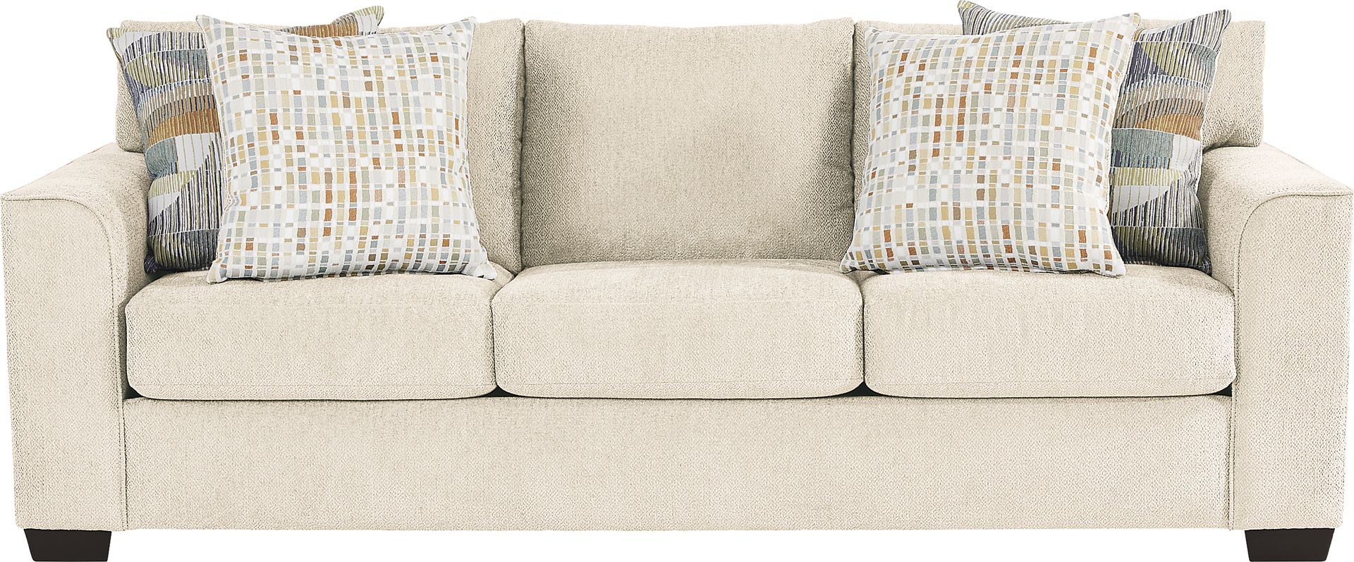 The Delcrest White Sofa features comfortable pillow backs and three seat cushions. While the specific cushion filling is not itemized, quality sofas, like those offered by Rooms To Go, typically utilize resilient cushioning materials designed to provide consistent support and resist sagging, ensuring your sofa remains comfortable and retains its aesthetic appeal for years.