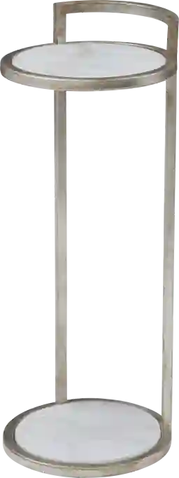 The Deldorf silver accent table is the perfect chair side accent. Features white marble inserts with silver leaf frame.