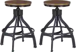 Discover the perfect blend of form and function with these adjustable-height Deleya stools that exude industrial elegance. The design showcases black, hand-distressed metal bases paired with poplar veneer seats in a warm brown finish, creating a striking contrast. Outfitted with rivet accents and a round footrest, these stools are not only stylish but also fully adjustable from 24 inches to 29 inches to accommodate any counter or bar. With a weight capacity of 225 pounds, they offer both durability and versatility for your home. Customer assembly is required.
